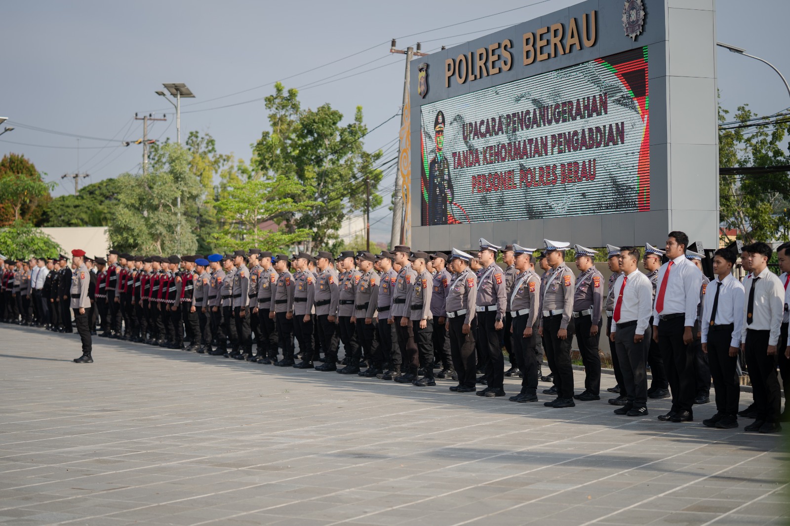 Upacara tersebut dihadiri oleh para pejabat utama Polres Berau, para perwira, pejabat upacara, serta seluruh peserta upacara. Dalam kegiatan ini juga dilaksanakan penyematan Tanda Kehormatan Satyalancana Pengabdian kepada personel yang telah mengabdi selama 32 tahun sebanyak 2 personel, 24 tahun sebanyak 12 personel, dan 8 tahun sebanyak 9 personel, sesuai dengan ketentuan yang berlaku.