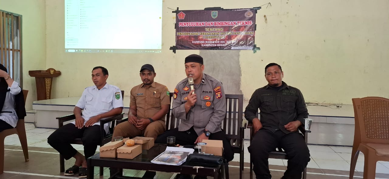 Biatan Ilir, Kabupaten Berau. Upaya pencegahan kebakaran hutan dan lahan (Karhutla) terus diperkuat jajaran Polsek Talisayan. Senin (08/12/2025) pukul 10.00 WITA, Pospol Biatan bersama BPBD Kecamatan Biatan menggelar Sosialisasi, Penyuluhan, dan Bimbingan Teknis Pencegahan Karhutla bertempat di Balai Pertemuan Kampung Biatan Ilir, Kecamatan Biatan, Kabupaten Berau.