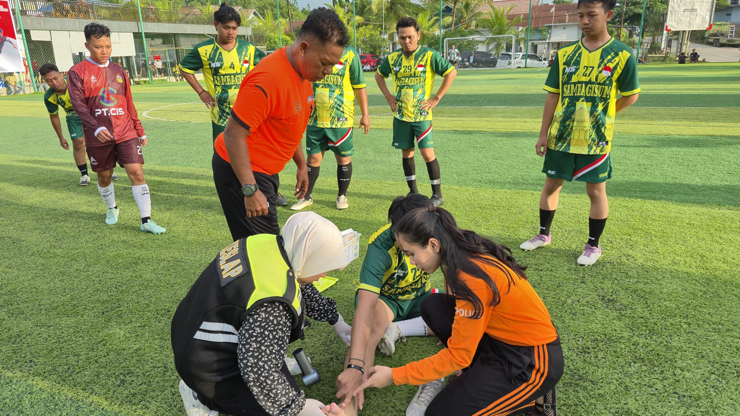 Berau, 18 Juni 2025 – Dalam rangka memeriahkan Hari Bhayangkara ke-79, Polres Berau menggelar turnamen Kapolres Cup Mini Soccer yang berlangsung di Lapangan Mini Soccer Jalan Raja Alam I, Kilometer 5, Kabupaten Berau, pada Rabu sore (18/6/2025). Guna menjamin keamanan dan keselamatan peserta selama pertandingan, Seksi Dokkes Polres Berau menurunkan tim untuk melaksanakan pelayanan kesehatan lapangan (keslap).