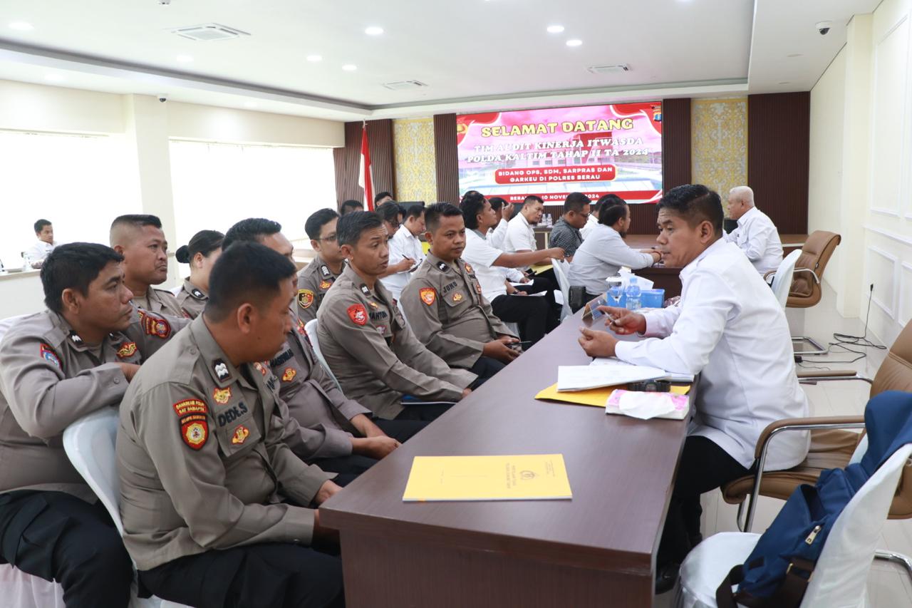 Tanjung Redeb, 5 November 2024, bertempat di Ruang Rupatama Polres Berau, telah dilaksanakan kegiatan Audit Kinerja Tahap II Aspek Pelaksanaan dan Pengendalian T.A. 2024 oleh Itwasda Polda Kaltim. Kegiatan ini dihadiri oleh tim audit yang dipimpin oleh Kombes Pol Yudhi Suhariyadi, SIK, serta seluruh PJU Polres Berau, Kapolsek Jajaran, dan perwakilan Bhabinkamtibmas dari Polsek Jajaran Polres Berau.