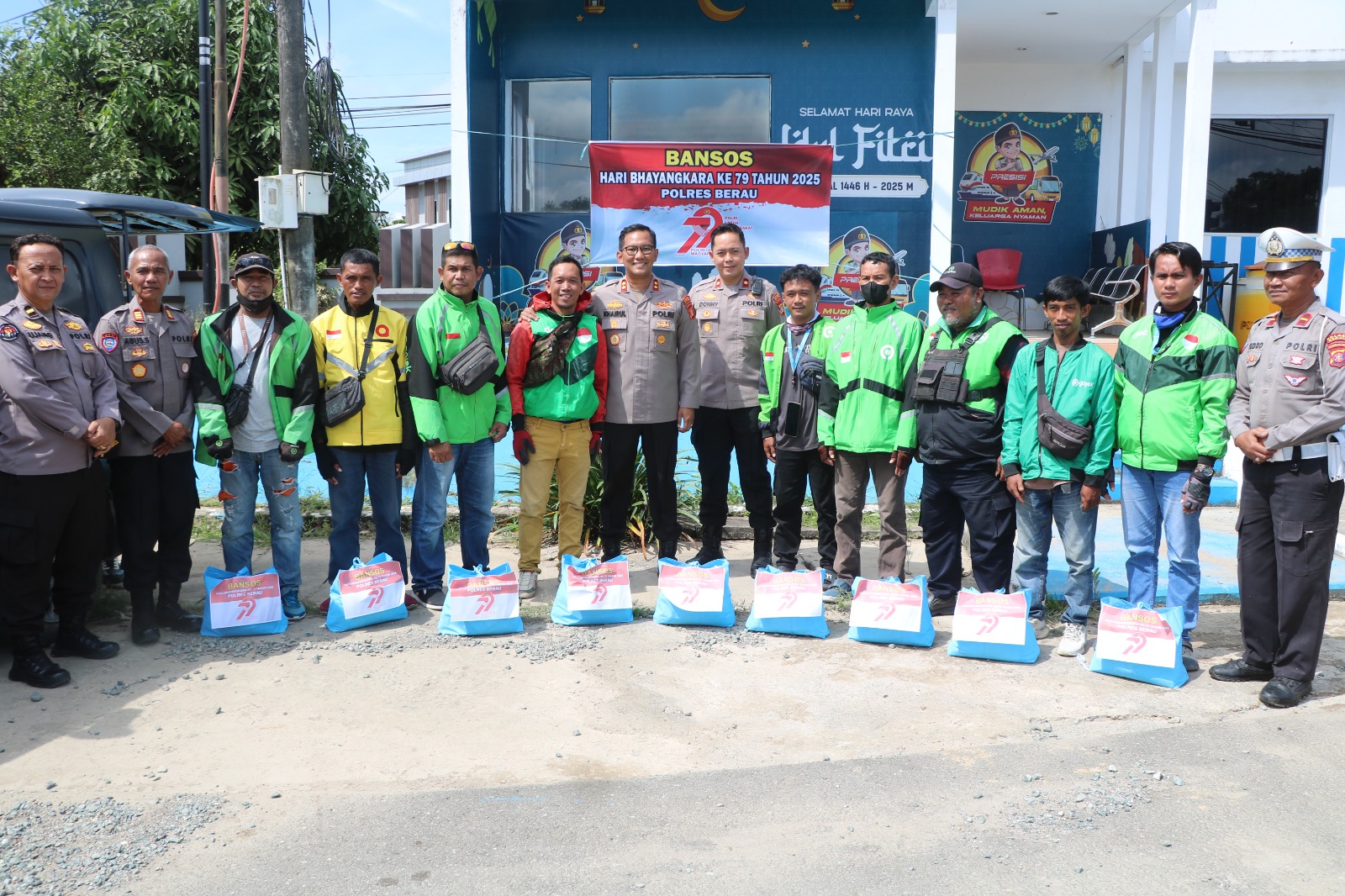 Polres Berau – Dalam rangka memperingati Hari Bhayangkara ke-79, Kapolres Berau AKBP Khairul Basyar bersama Wakapolres Kompol Dony Dwija Romansa dan Kasat Binmas AKP Agus Supriyanto melaksanakan kegiatan pembagian bantuan sosial (bansos) kepada para petugas kebersihan dan pengemudi ojek online (ojol). Kegiatan tersebut berlangsung di Pos Polisi Kilometer 5, Tanjung Redeb, Selasa (24/6/2025).