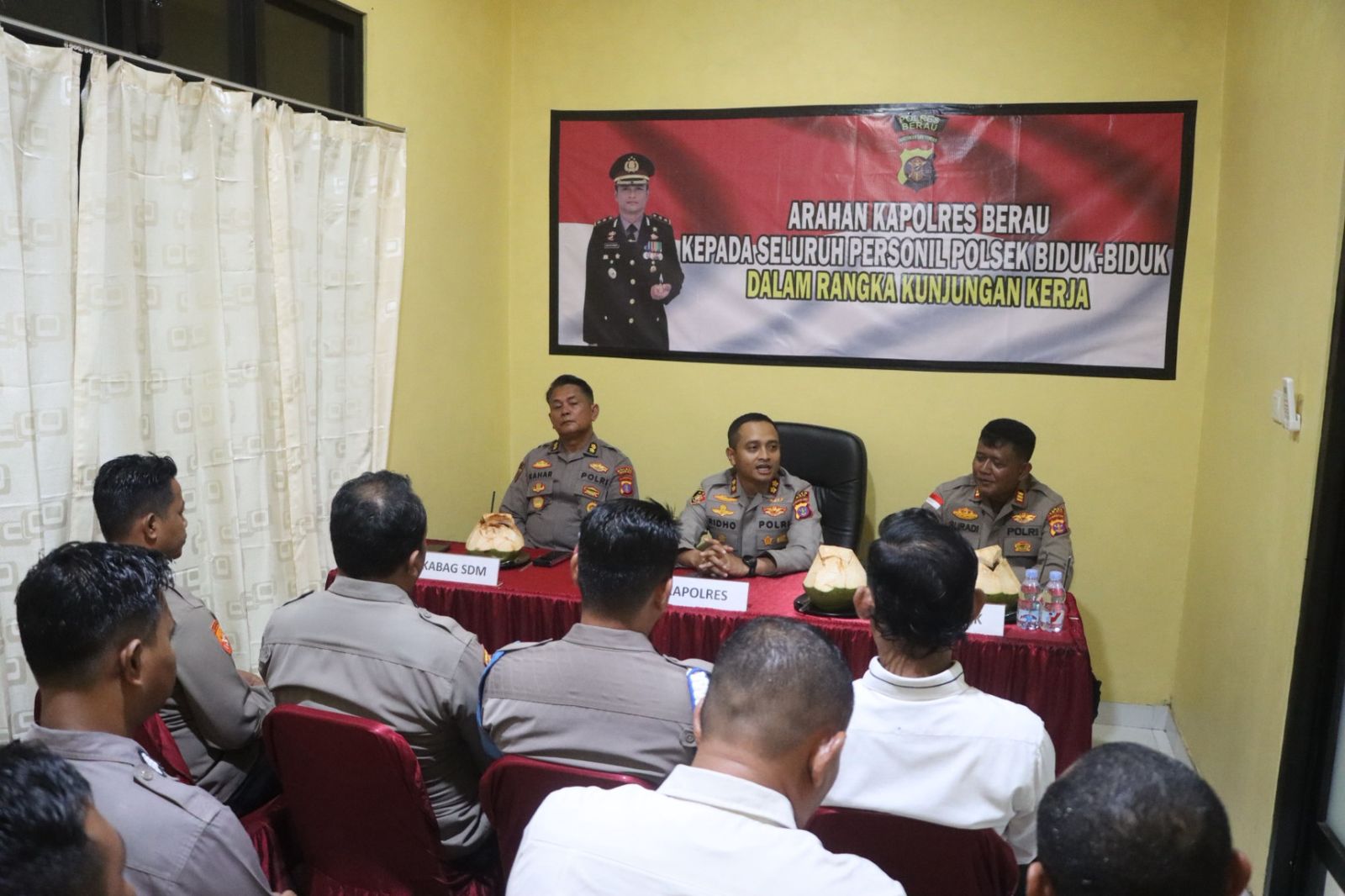 Kegiatan diawali dengan penyambutan dan laporan situasi dari Kapolsek Biduk-Biduk, dilanjutkan dengan pengecekan ruangan per-unit di Mako Polsek. Setelah itu, Kapolres menggelar tatap muka dengan seluruh personel untuk memberikan arahan terkait pelaksanaan tugas dan tanggung jawab kepolisian di wilayah hukum Polsek Biduk-Biduk.