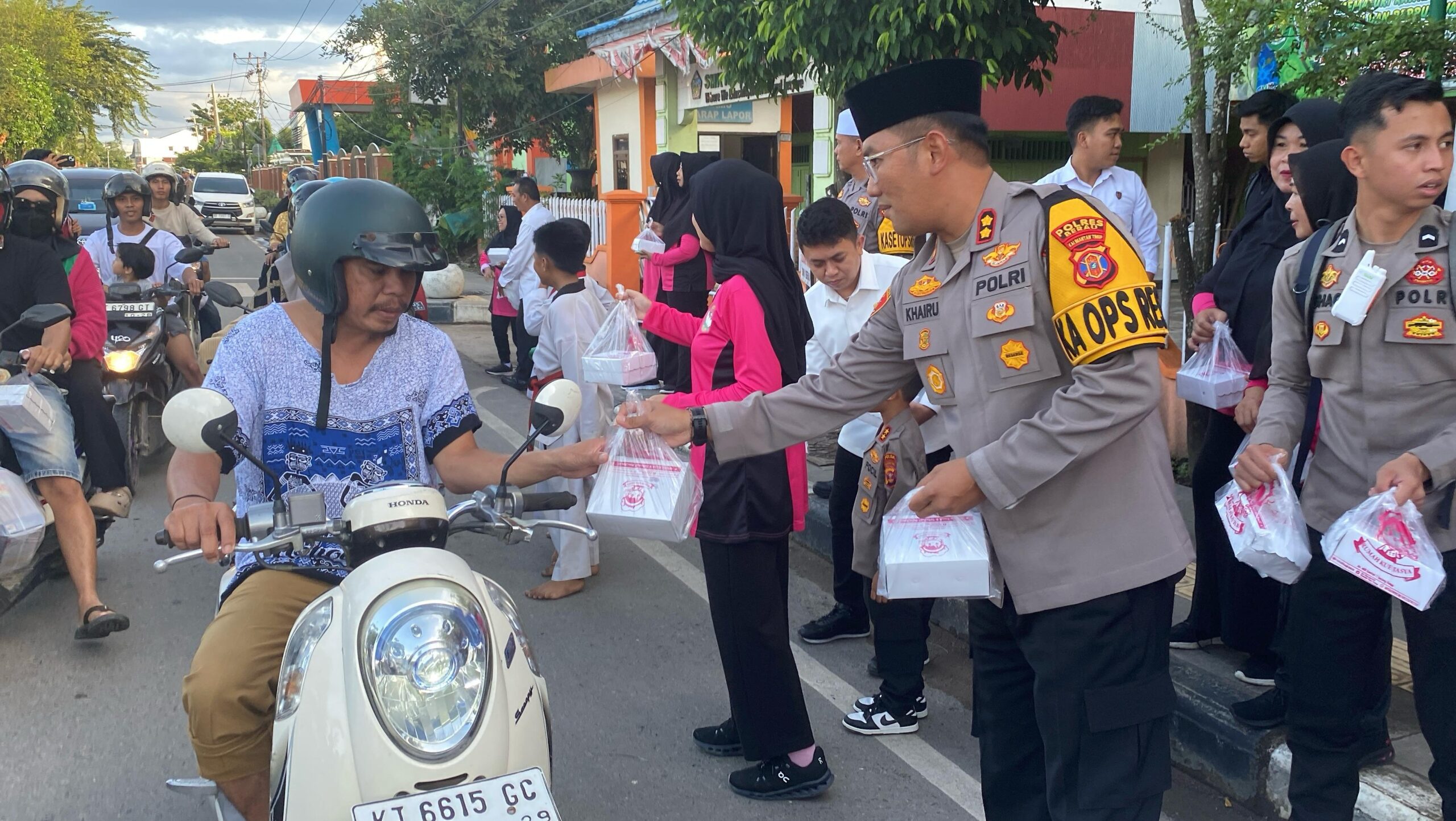Polres Berau – Dalam semangat berbagi di bulan Ramadan, Kapolres Berau AKBP Khairul Basyar bersama personel dan Bhayangkari membagikan takjil kepada para pengguna jalan di sekitar kawasan Tanjung Redeb. Kegiatan ini merupakan bentuk kepedulian Polres Berau kepada masyarakat yang sedang menjalankan ibadah puasa.