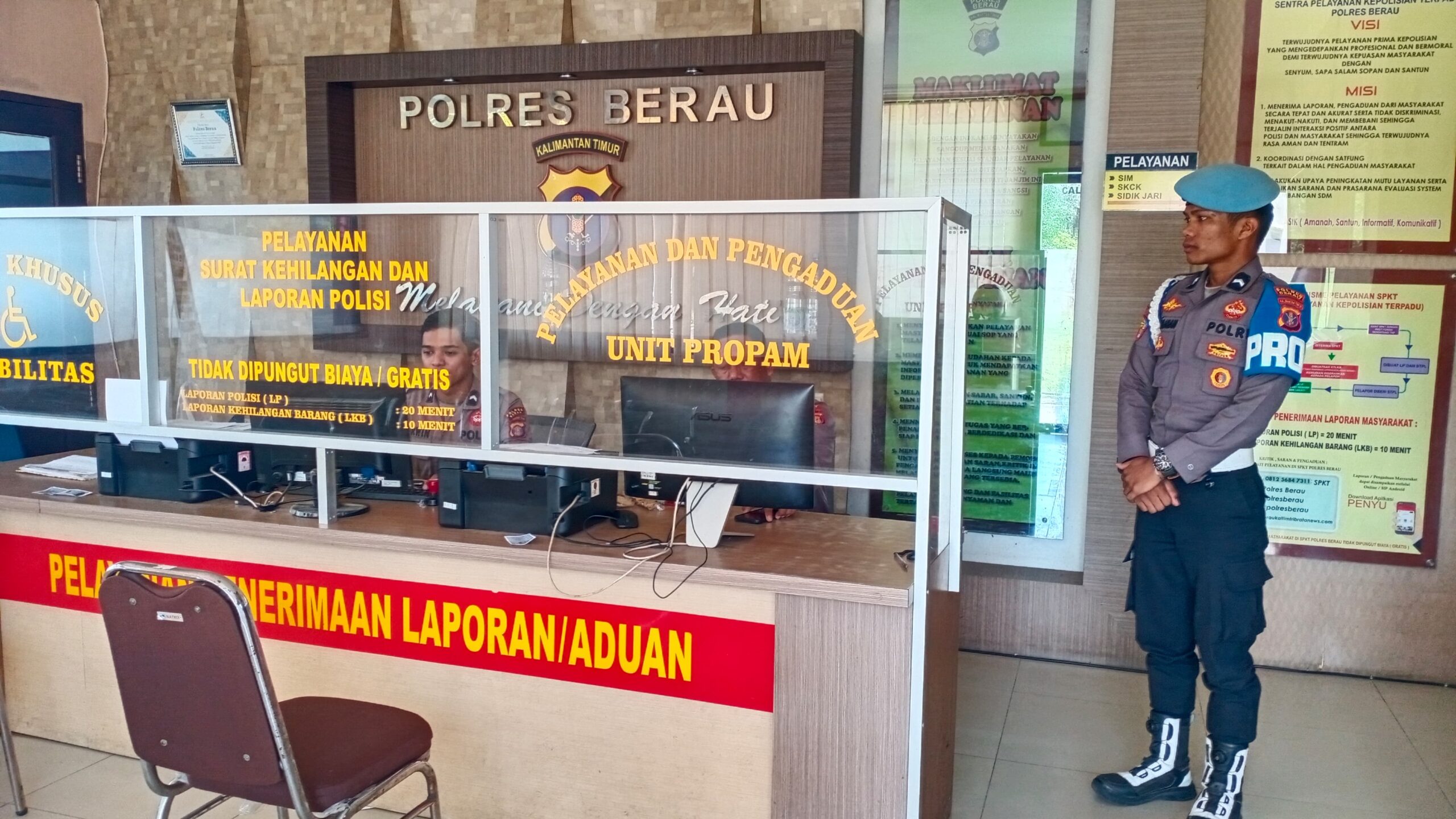 Personel Sipropam Polres Berau melaksanakan pengamanan di dua lokasi pelayanan publik penting, yaitu Pelayanan Terpadu Polres Berau yang berlokasi di Gedung Merah Putih, Jalan Pemuda, Tanjung Redeb, serta Kantor Bersama Samsat yang terletak di Jalan Dr. Murjani 1 No. 86, Tanjung Redeb.