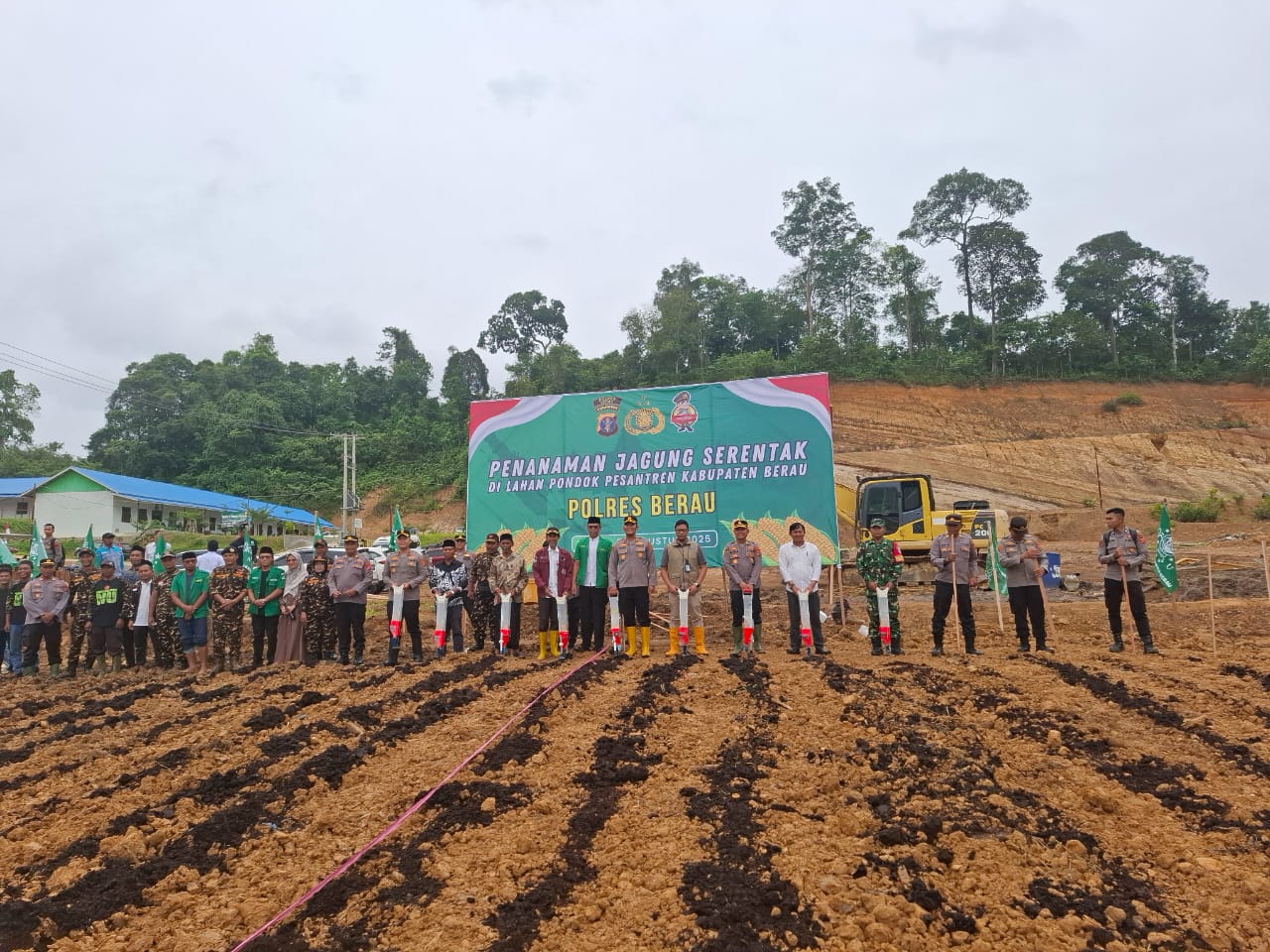 Polres Berau – Dalam upaya mendukung program ketahanan pangan nasional, Polres Berau melaksanakan kegiatan penanaman jagung serentak di lahan Pondok Pesantren Annahdiyyah, Kelurahan Rinding, Kecamatan Teluk Bayur, pada Rabu (6/8/2025).