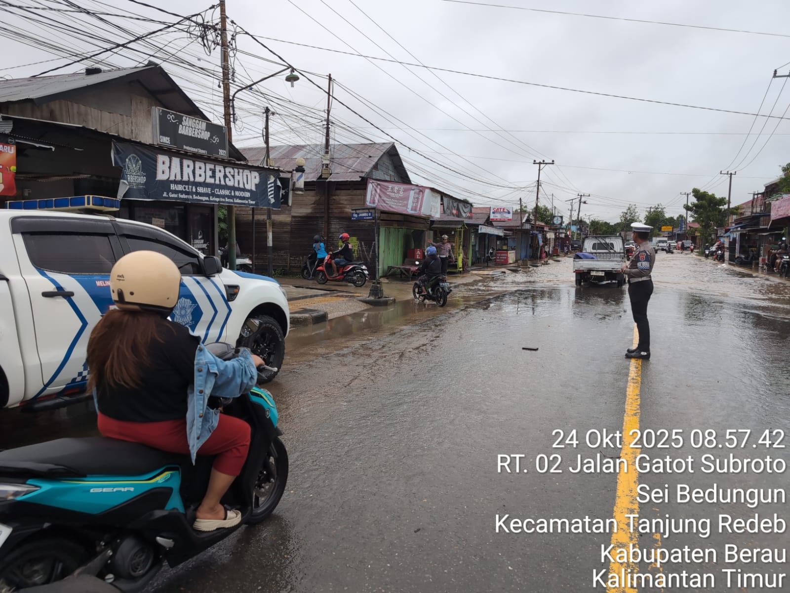 Melalui laporan dari layanan 110 Polres Berau, petugas menerima informasi adanya genangan air di badan jalan pasca hujan deras yang berpotensi menyebabkan kemacetan. Menindaklanjuti laporan tersebut, personel Sat Lantas segera menuju lokasi untuk melakukan pengaturan arus lalu lintas dan memastikan keamanan para pengguna jalan di sekitar titik genangan tersebut.