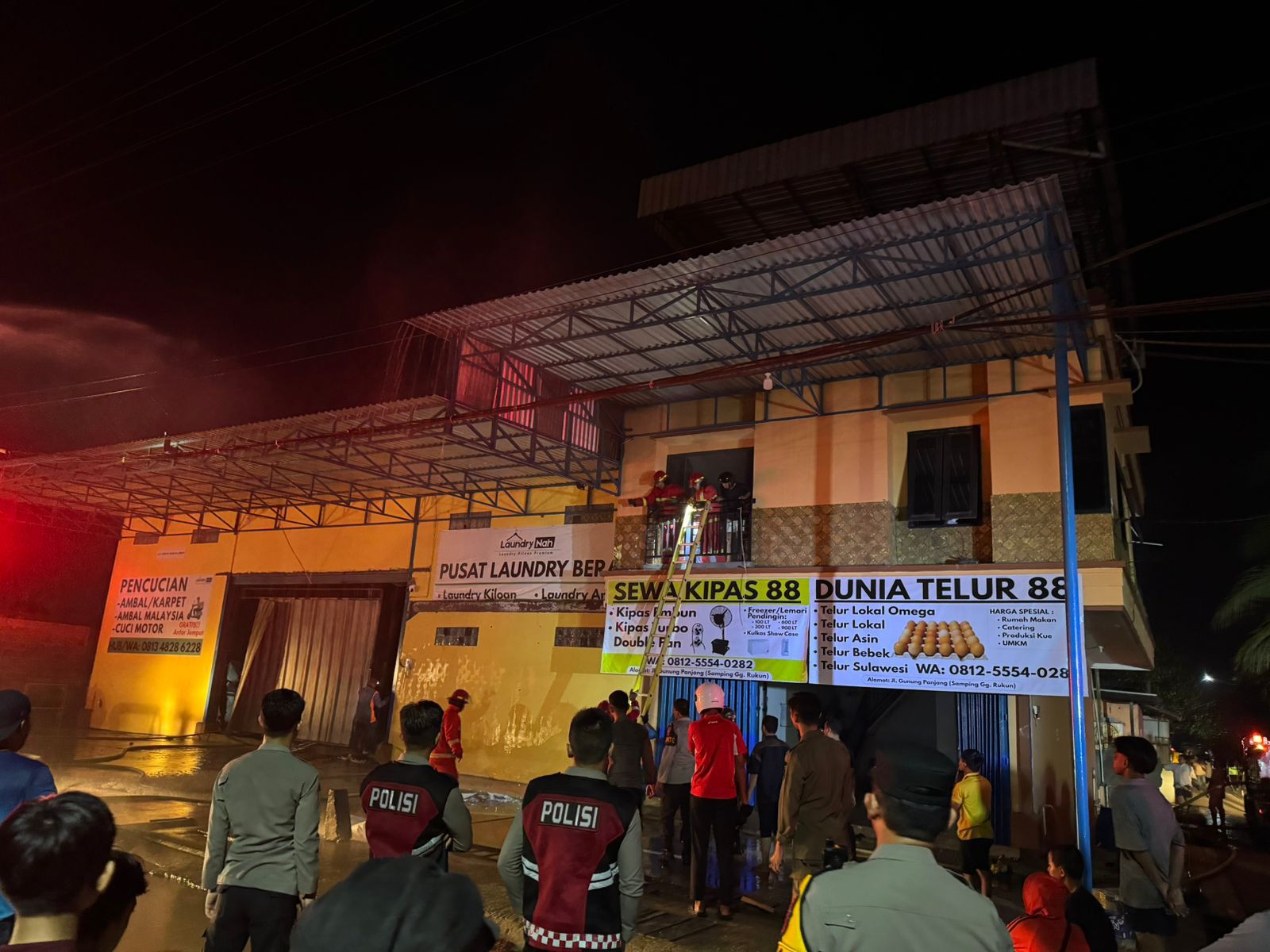 Ruko tersebut diketahui milik H. Mustari yang disewakan kepada seorang pengusaha bernama Gusti. Ruko difungsikan sebagai tempat usaha laundry, gudang telur, serta kantor pribadi. Menurut keterangan dari saksi di lokasi, sekitar pukul 19.00 Wita, saksi Anika yang bekerja di ruko mencium bau gosong di lantai dua. Hal ini juga dirasakan oleh penyewa ruko, Gusti, yang kemudian melakukan pengecekan, khususnya di sekitar tabung gas elpiji yang berada di area laundry.