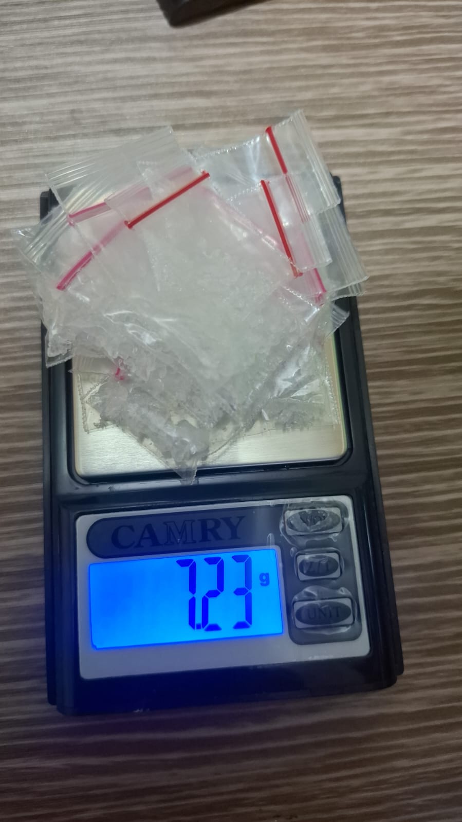Barang bukti yang berhasil diamankan antara lain 15 bungkus kecil yang diduga berisi sabu dengan total berat bruto 7,23 gram, satu unit timbangan digital warna hitam, 11 potong sedotan warna hitam, empat sendok sabu yang terbuat dari sedotan, satu gunting warna hitam, satu bendel plastik klip, dua bendel bekas pembungkus sabu, satu tempat kacamata warna hitam, satu bendel sedotan warna hitam, satu tas kecil warna hitam, satu unit sepeda motor warna merah, serta satu unit telepon genggam warna putih.