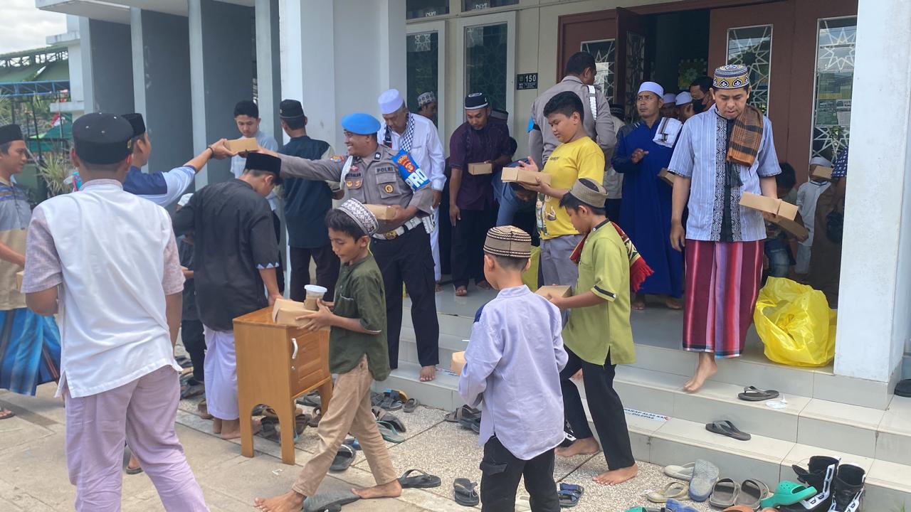 Setelah sholat, pada pukul 13.00 WITA, Kasipropam dan tim membagikan nasi kotak kepada jemaah di masing-masing masjid. Sebanyak 300 kotak nasi dibagikan sebagai bentuk kepedulian dan berbagi kepada masyarakat.