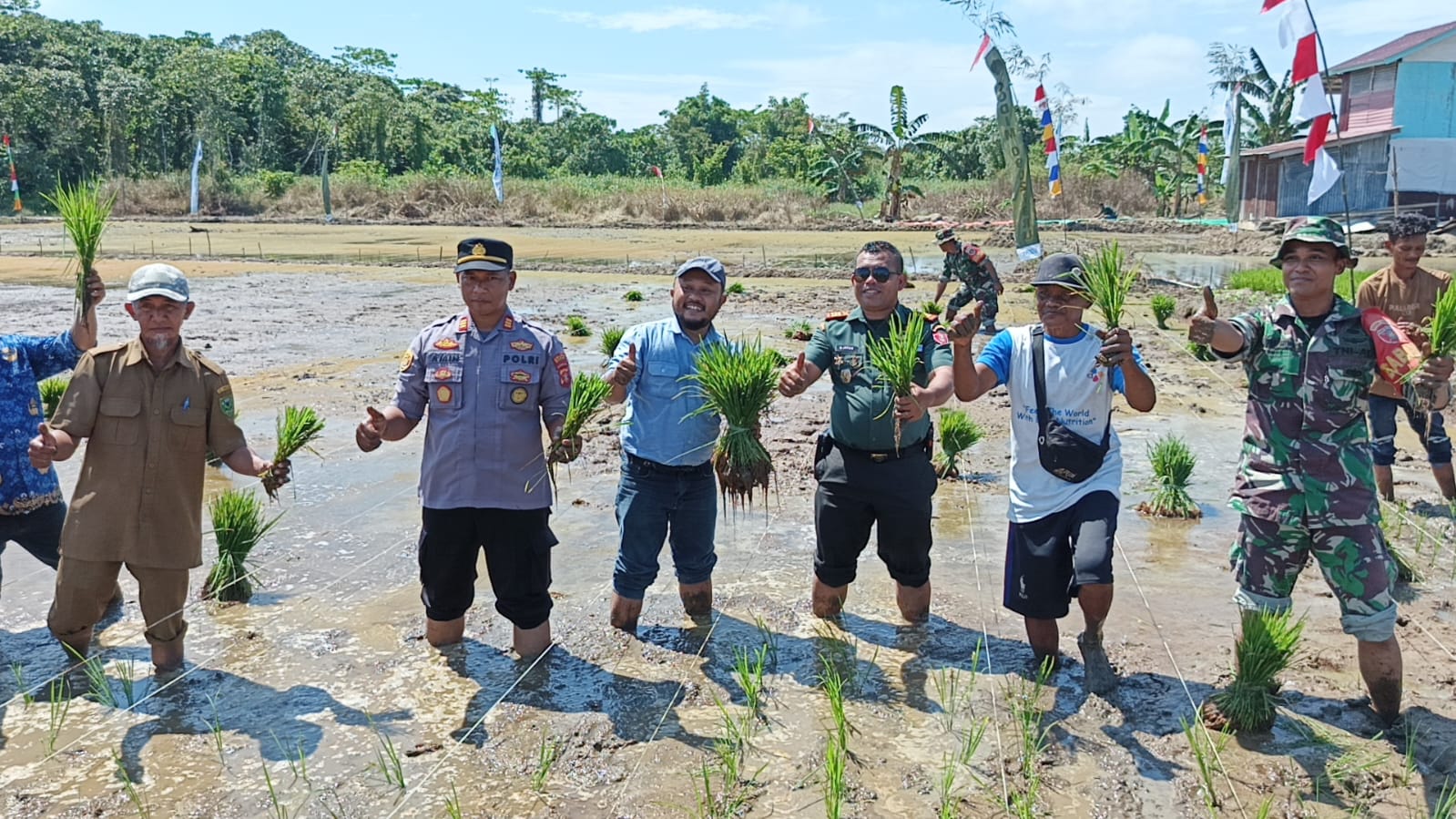Berau, 17 Juni 2025 – Upaya mendukung program ketahanan pangan terus dilakukan oleh jajaran Polsek Sambaliung. Salah satunya diwujudkan melalui kegiatan penanaman padi perdana hasil demplot perbanyakan benih unggul varietas IR 48 dan AGT 303 di lahan masyarakat Kampung Gurimbang RT 05, Kecamatan Sambaliung, Kabupaten Berau.